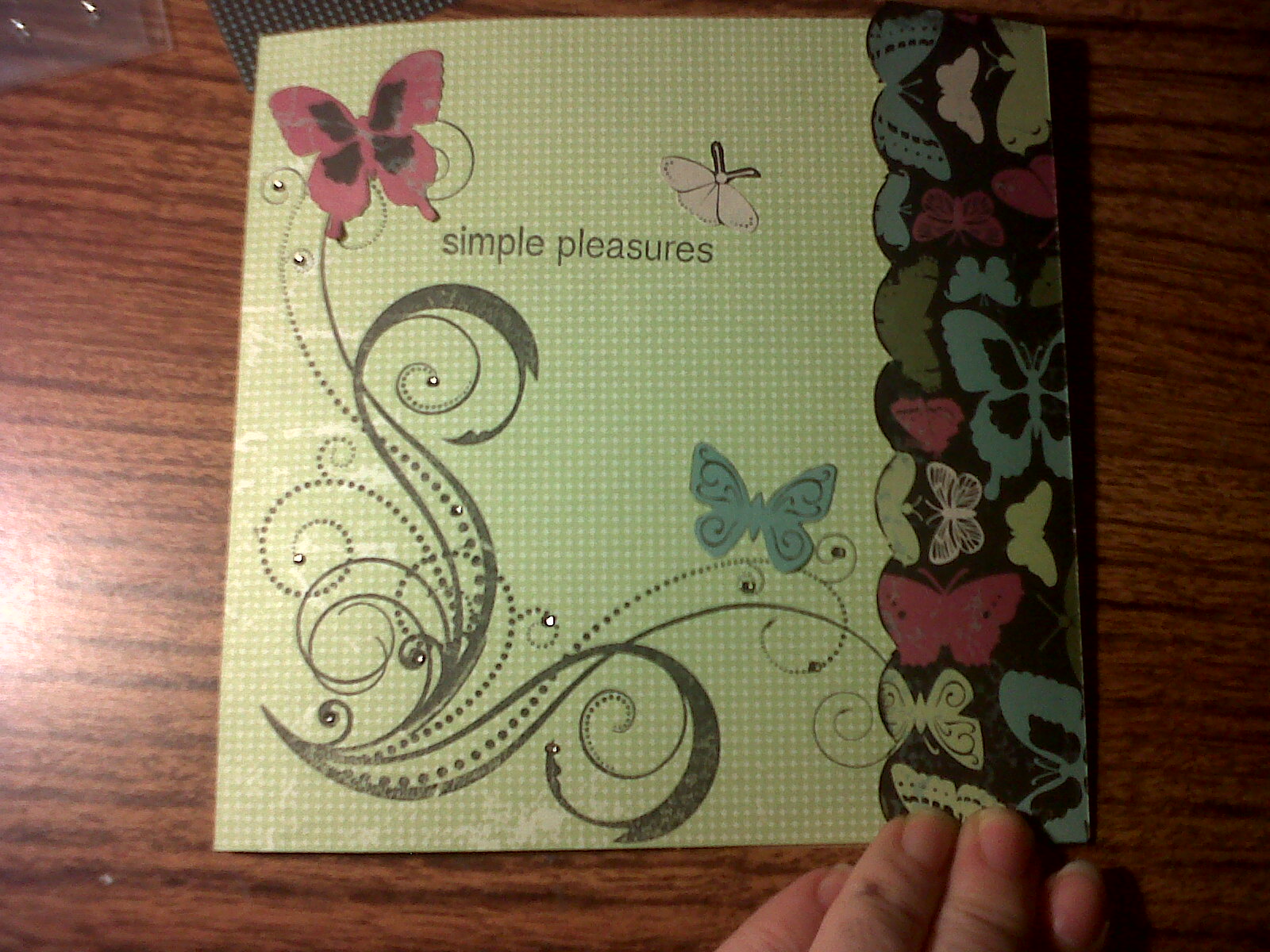 First, I made a card for a group I’m in called RAK – Random Acts of Kindness. Each month we get a different RAK partner and we send something handmade to our partner just to let her know we are thinking of her. The lady I made this card for loves butterflies. That enabled me to use the Wings paper I had left over from the Spring of 2011. For the card, I used the Die Cut Cards & Envelopes. I covered the flap of the card in the dark, butterfly covered paper. The excess paper I cut out different butterflies. I used the green side of another Wings paper and cut it to fit the other side of the card. I stamped the green paper with one of my favorite stamp sets, Love Life. Then, I glued down the butterflies I cut out.